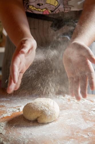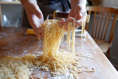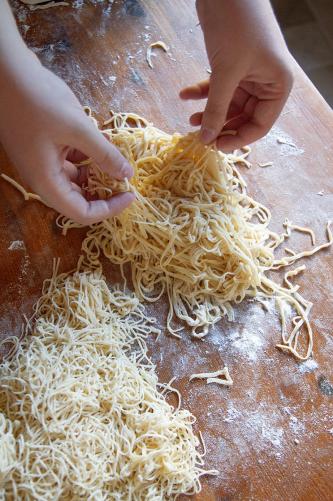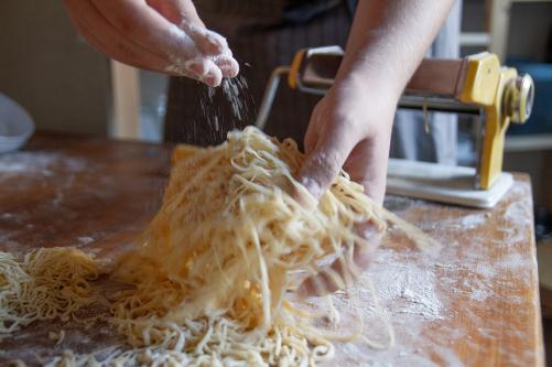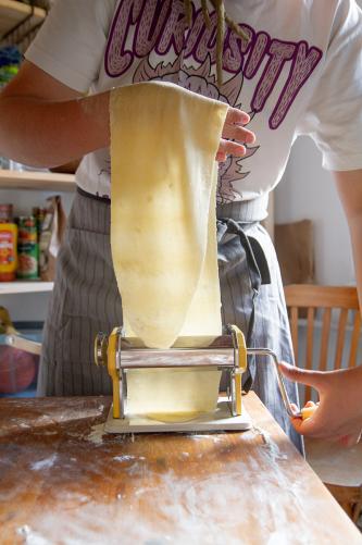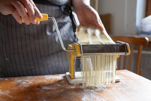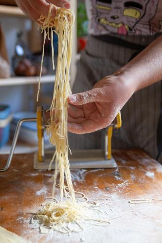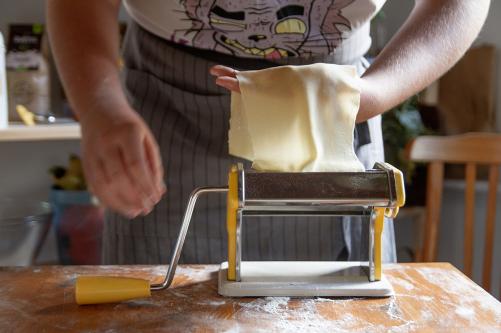 2. Darba virsmu pārkaisa ar miltiem, pastas mašīnu iesmērē ar eļļu. Mīklu vispirms izrullē cik plānu vēlas, tad sagriež to vēlamas formas. Jau gatavu pastu apvārta miltos un ļauj "atpūsties".